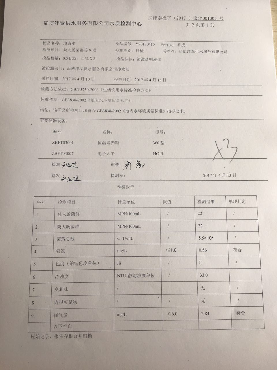 淄博灃泰供水服務有限公司地表水檢測日報表