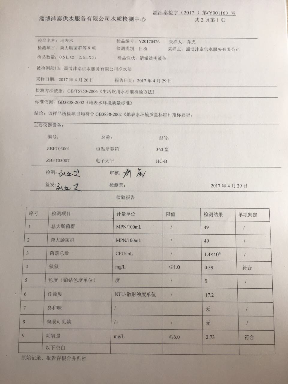 淄博灃泰供水服務有限公司地表水檢測日報表