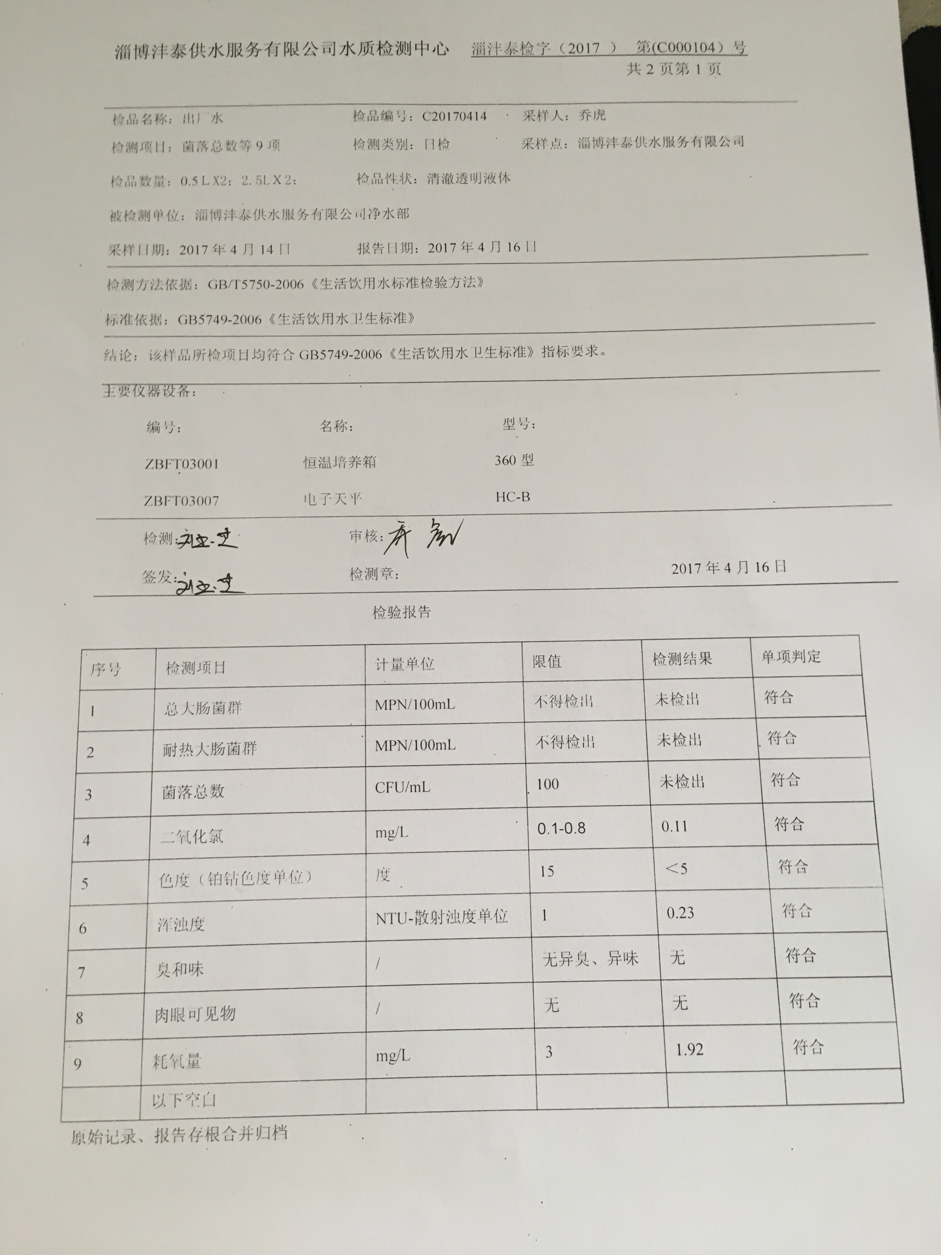 淄博灃泰供水服務有限公司水質檢測日報表