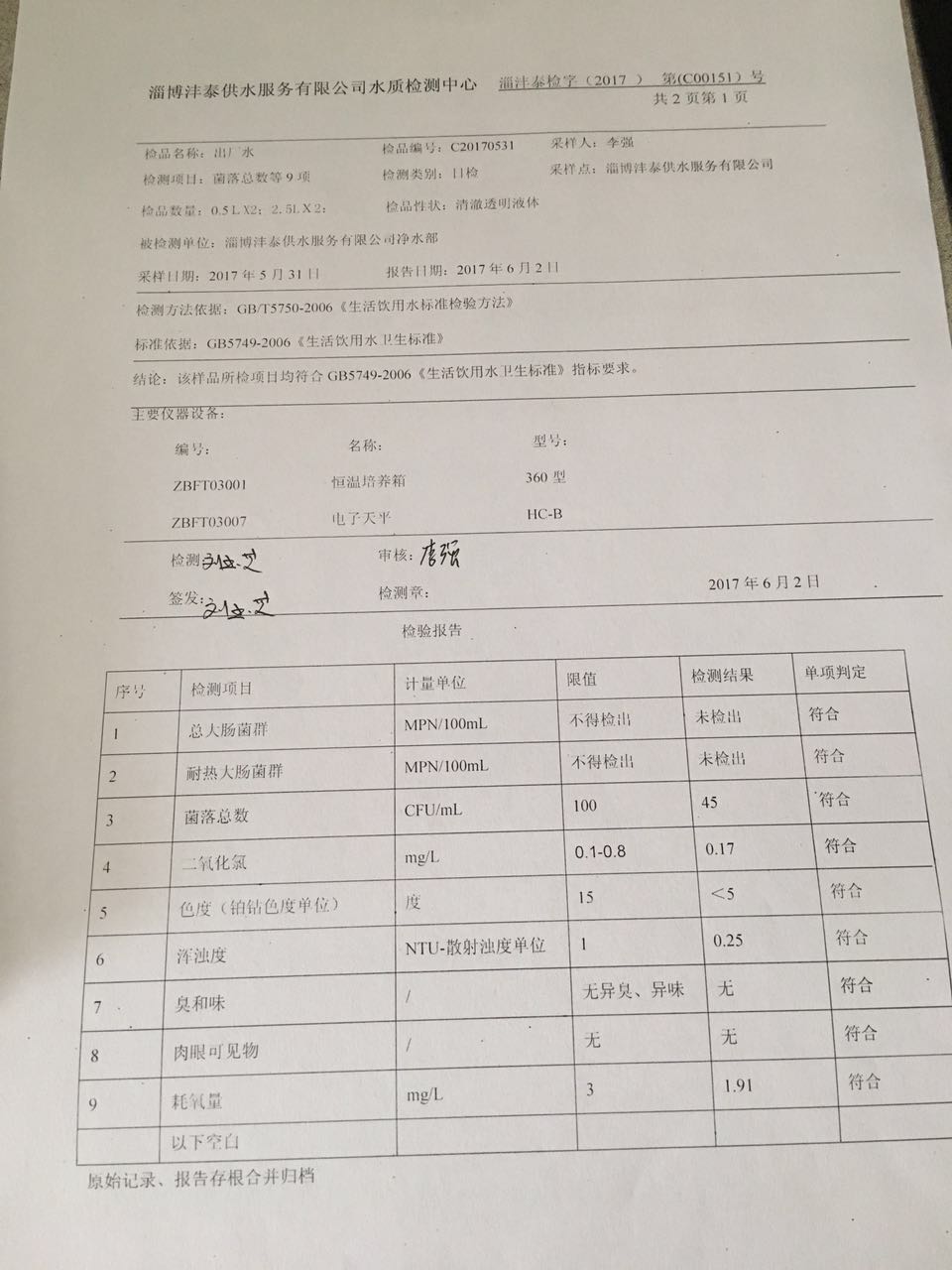 淄博灃泰供水服務有限公司水質檢測日報表