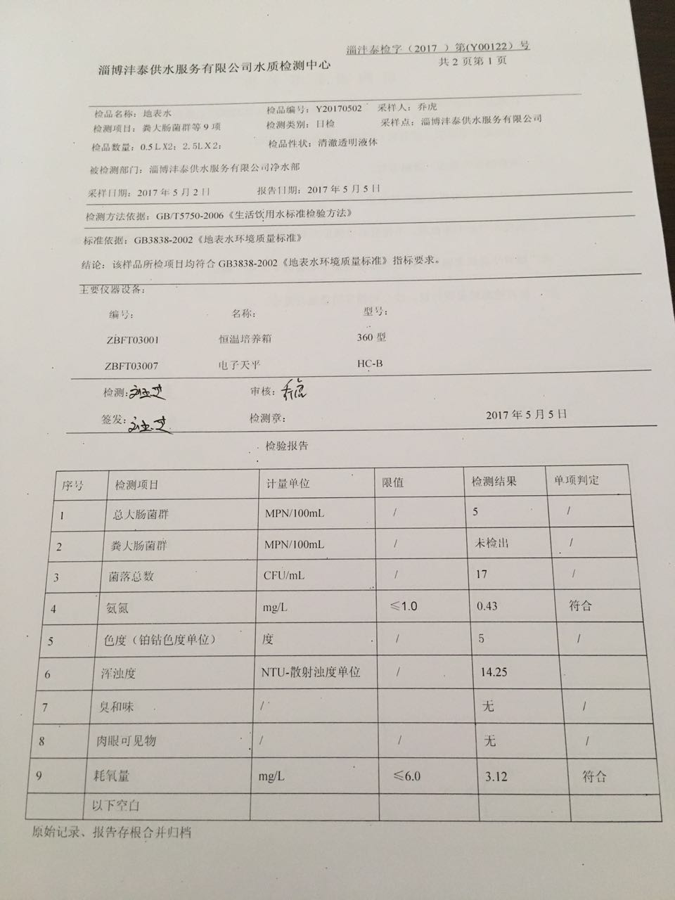 淄博灃泰供水服務有限公司地表水檢測日報表