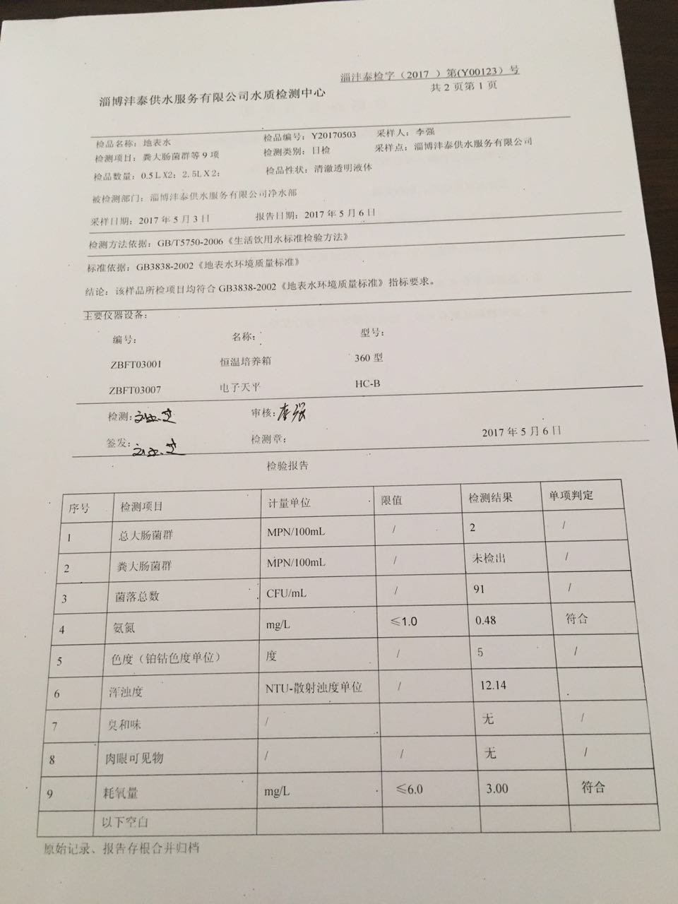 淄博灃泰供水服務有限公司地表水檢測日報表