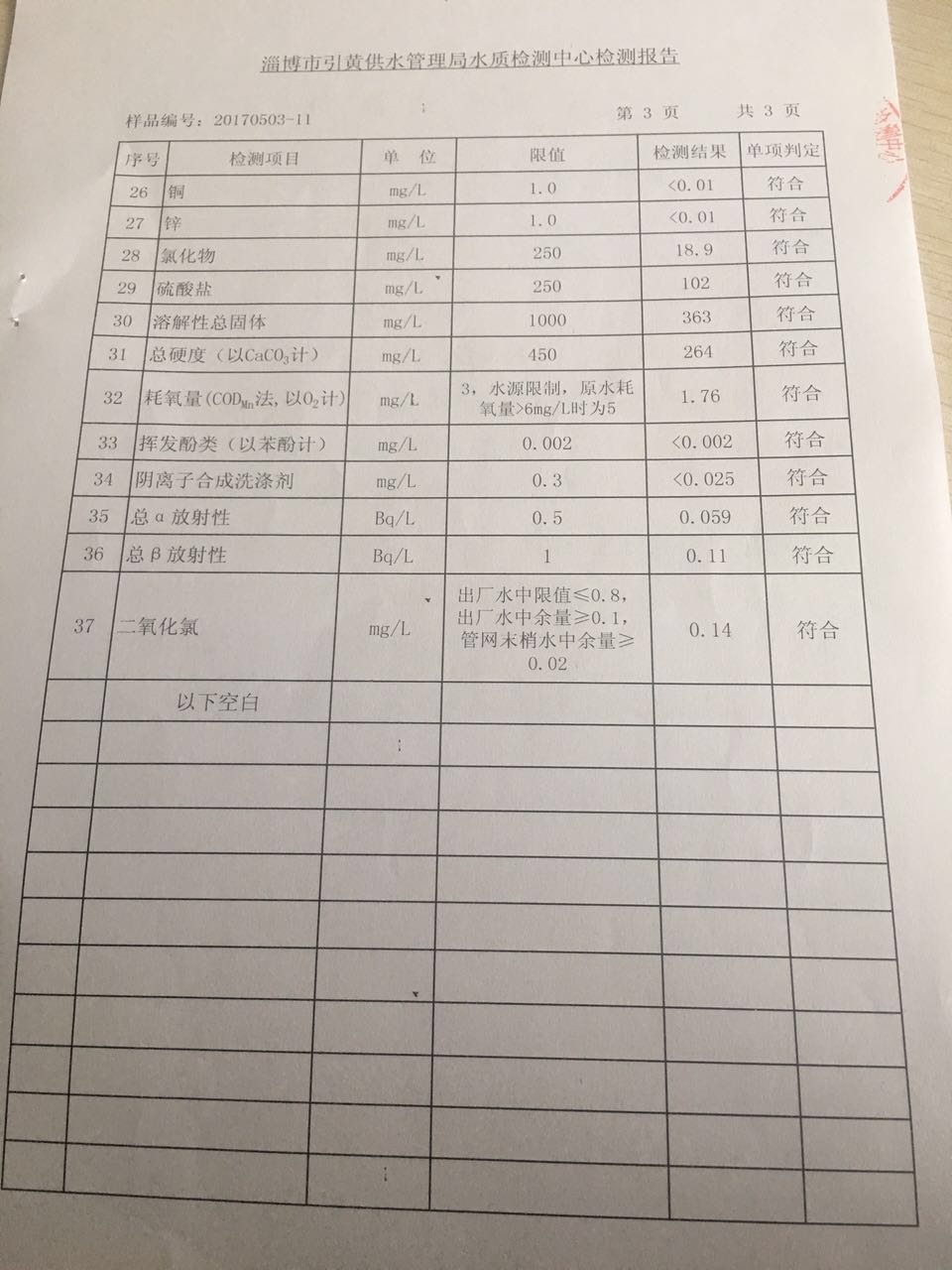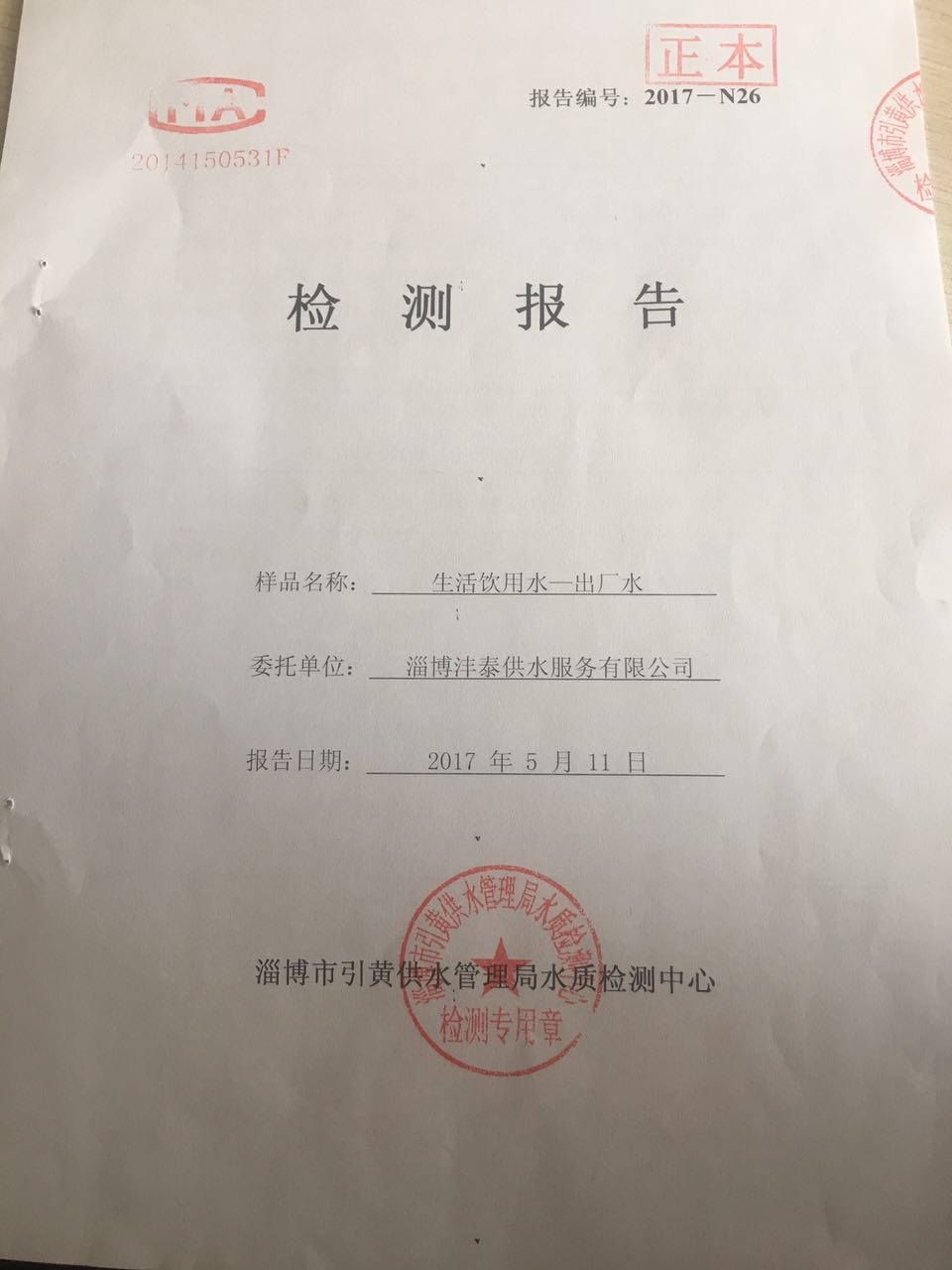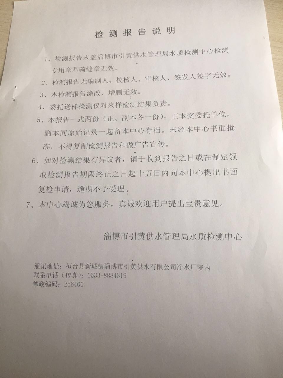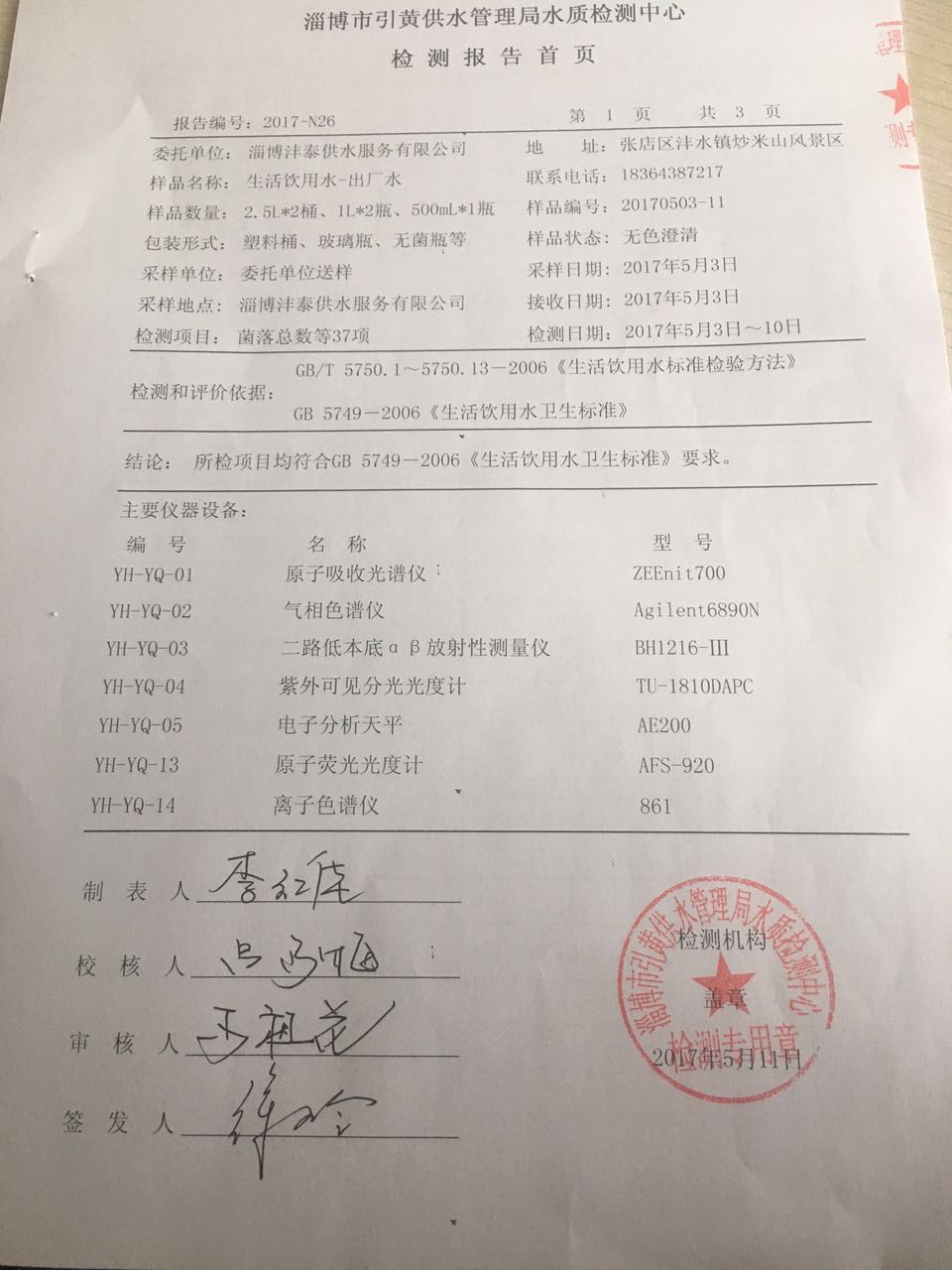 淄博灃泰供水服務有限公司生活飲用水月檢報告