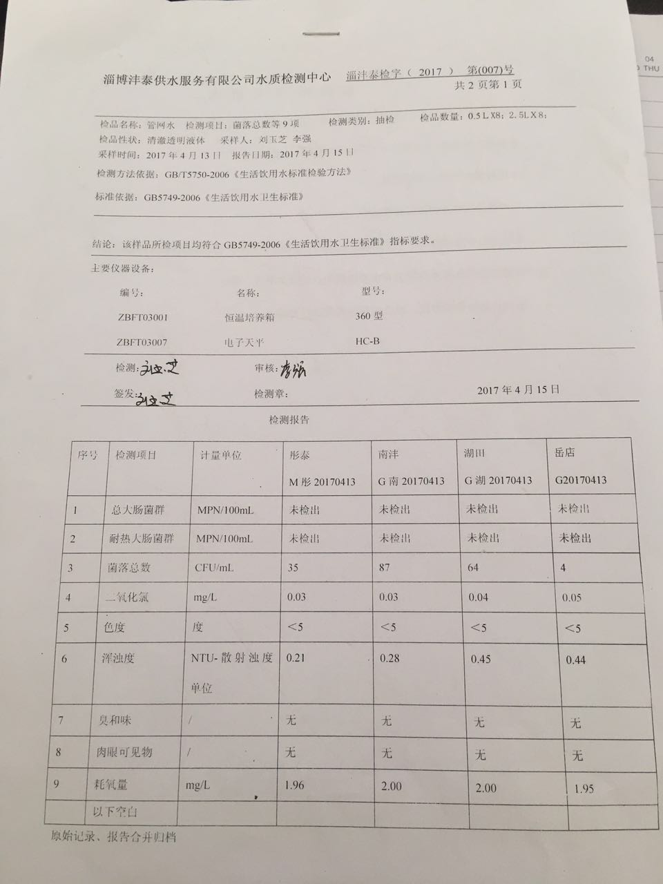 淄博灃泰供水服務有限公司管網水抽檢報告