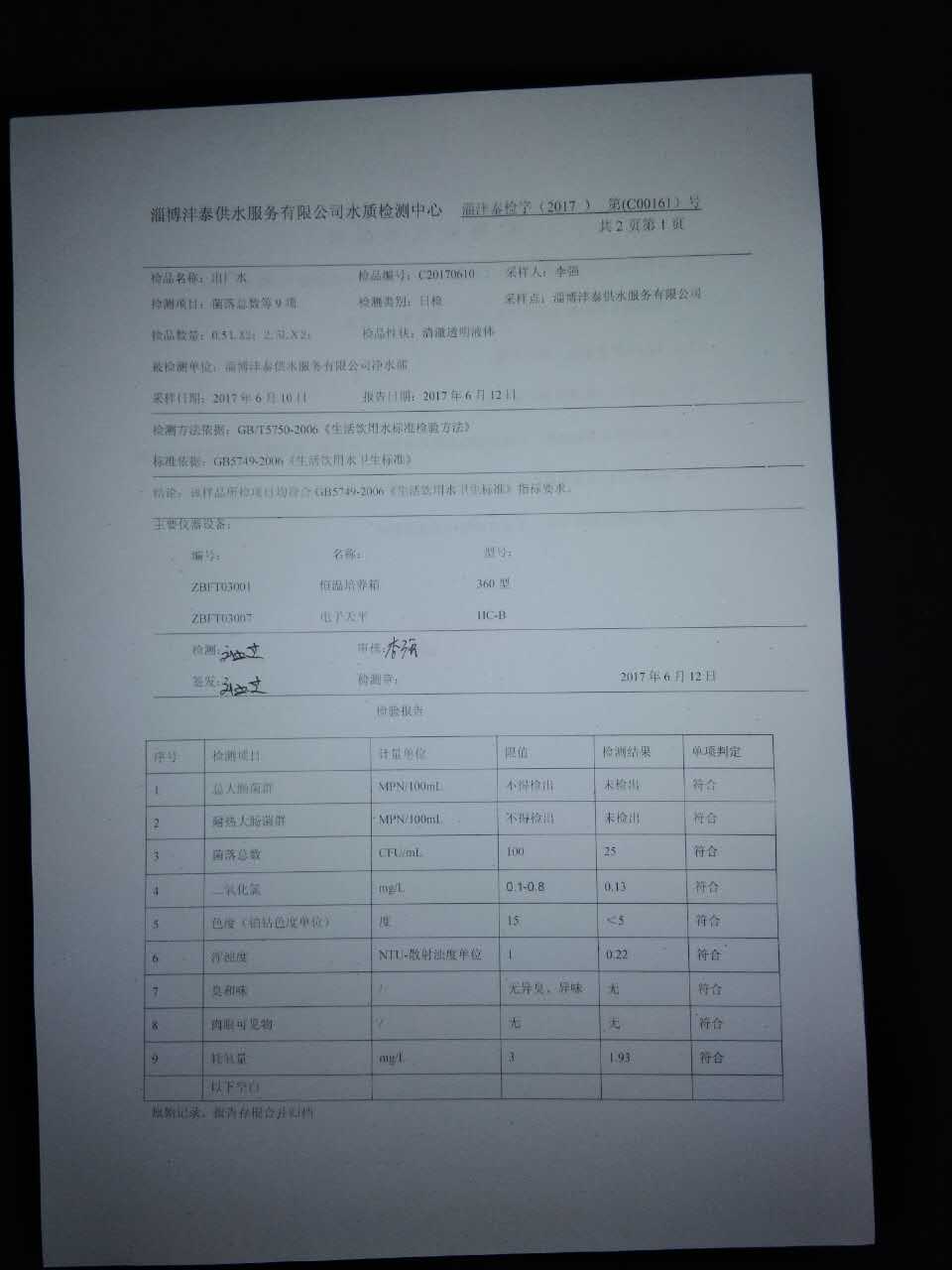 淄博灃泰供水服務有限公司水質檢測日報表
