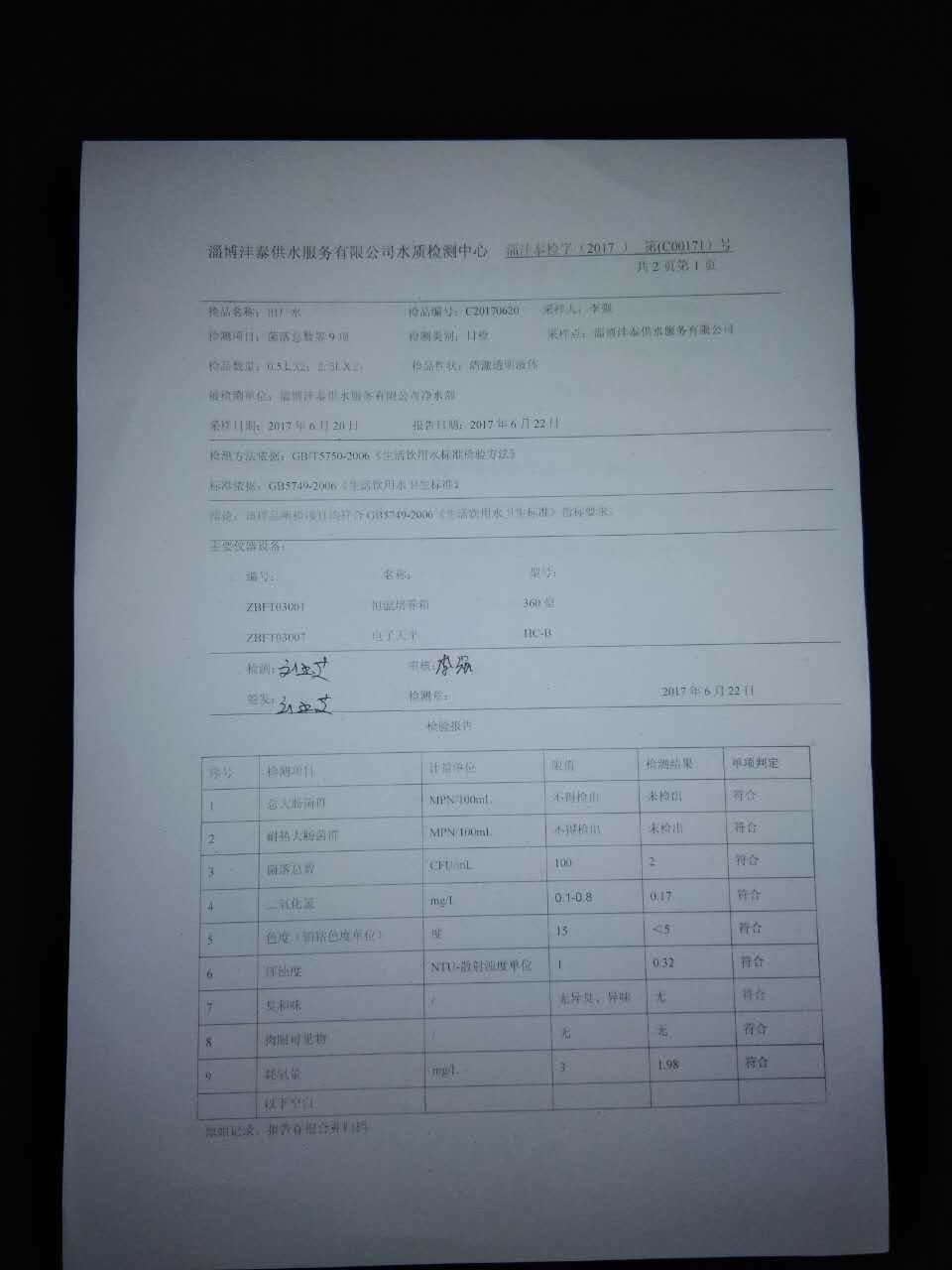 淄博灃泰供水服務有限公司水質檢測日報表