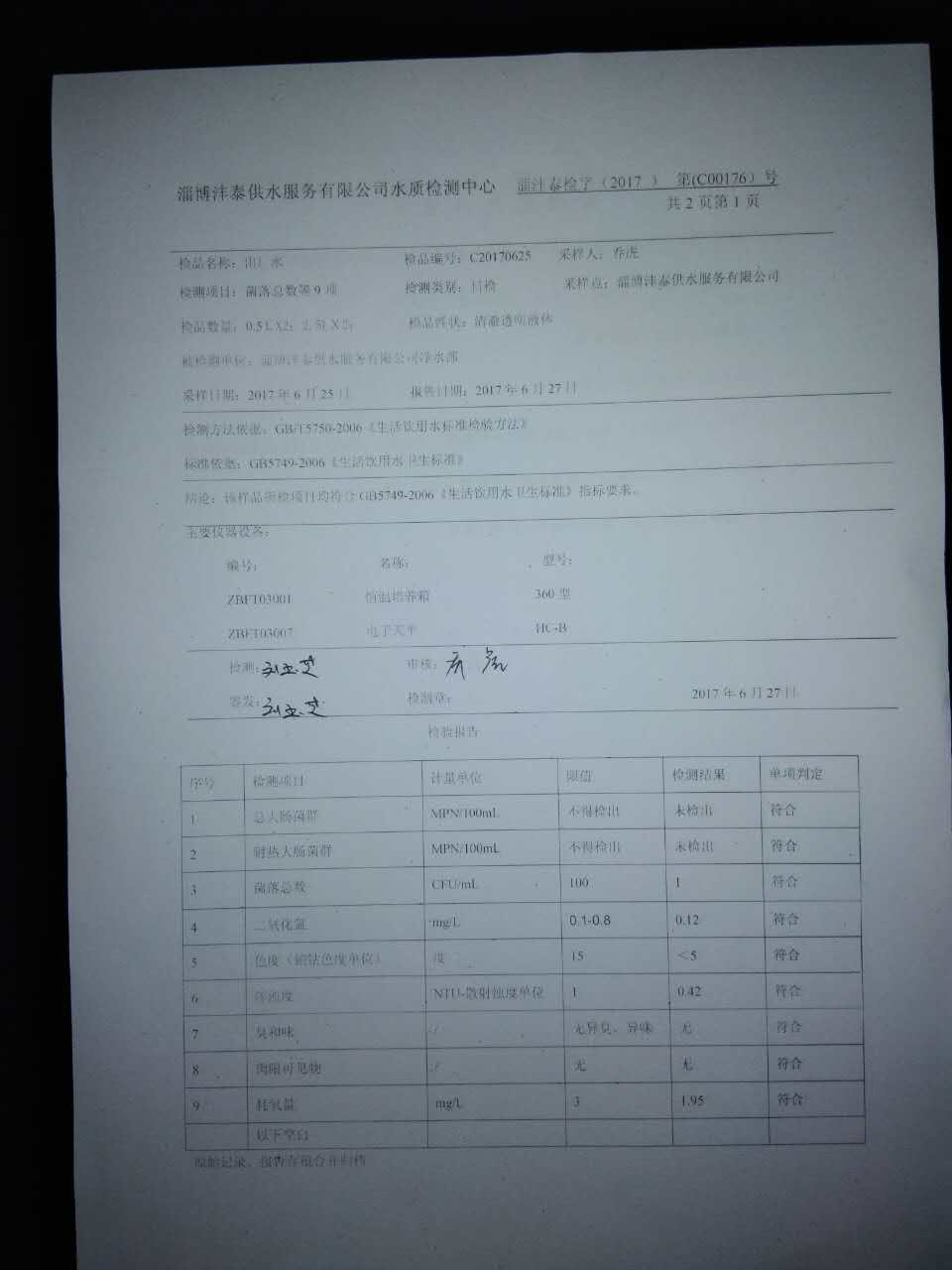 淄博灃泰供水服務有限公司水質檢測日報表