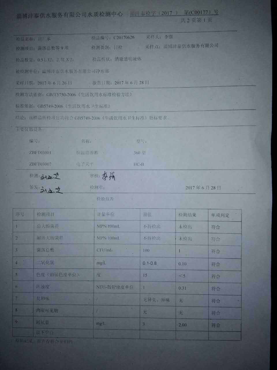 淄博灃泰供水服務有限公司水質檢測日報表