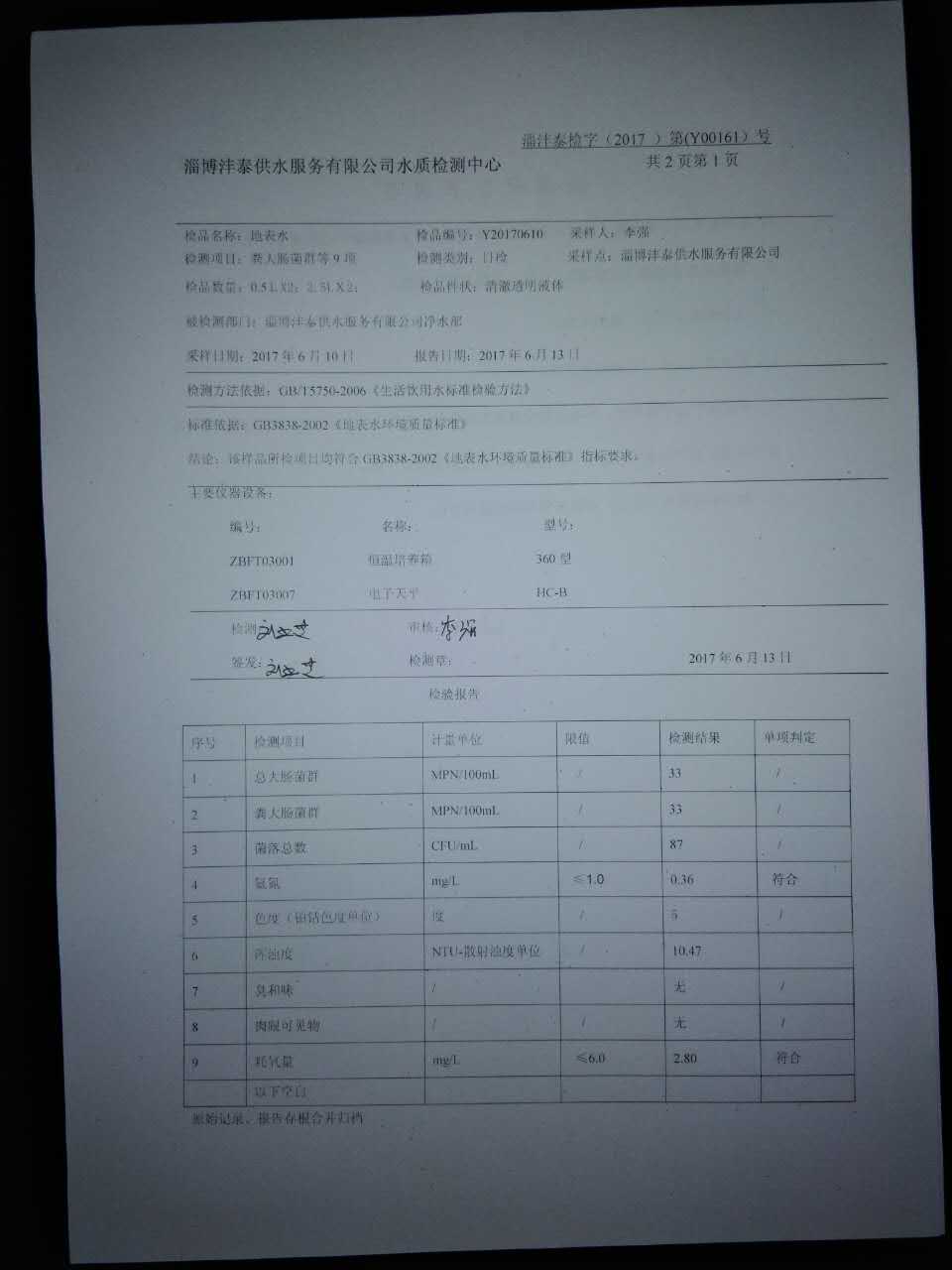 淄博灃泰供水服務有限公司地表水檢測日報表