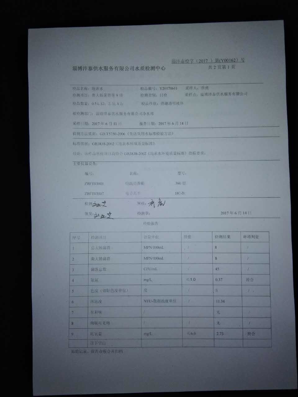 淄博灃泰供水服務有限公司地表水檢測日報表