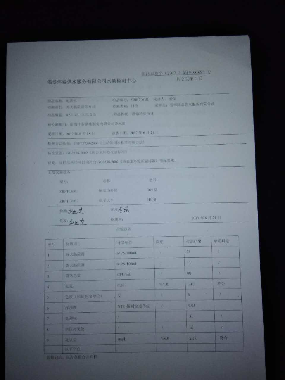 淄博灃泰供水服務有限公司地表水檢測日報表