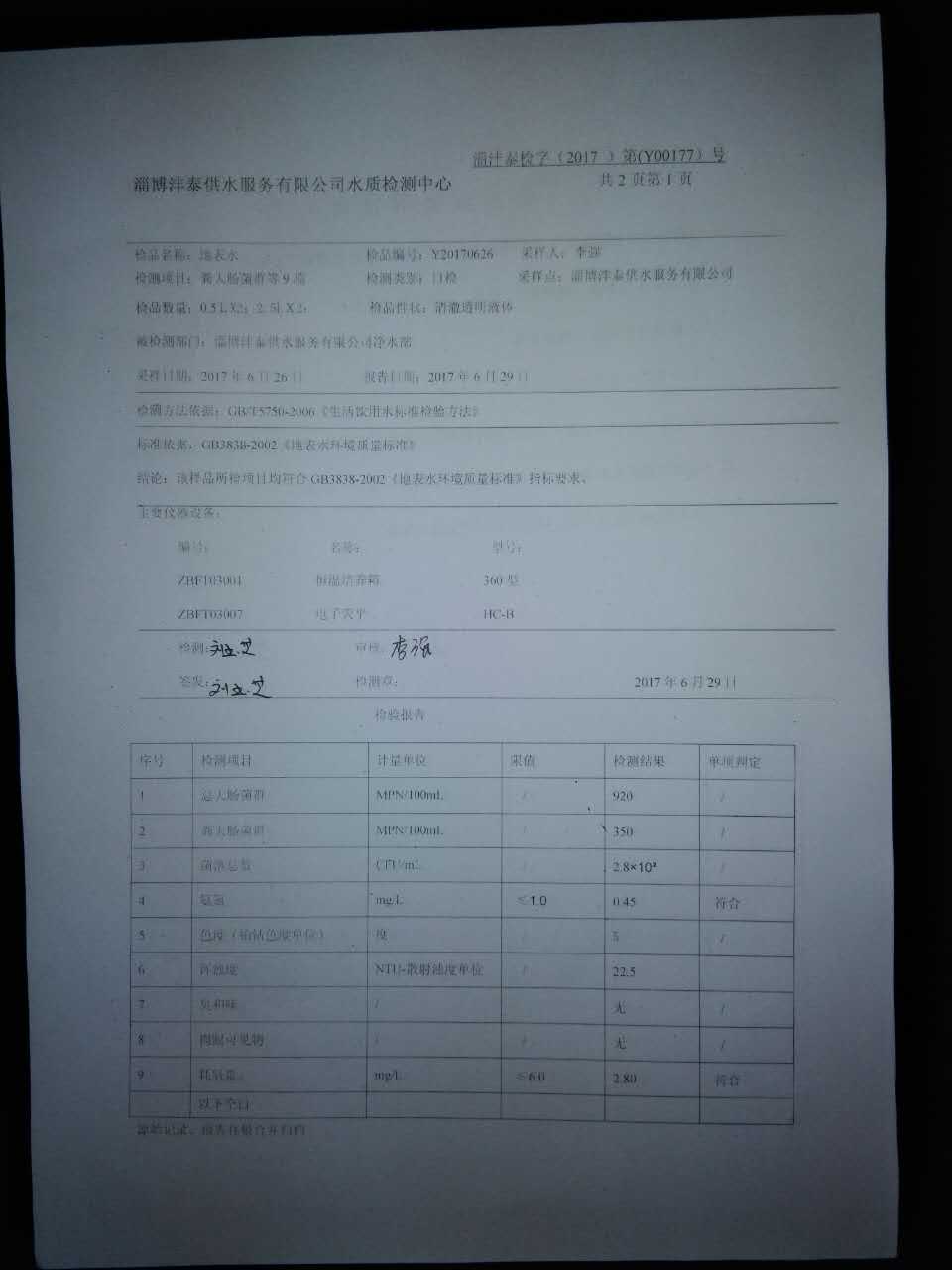 淄博灃泰供水服務有限公司地表水檢測日報表