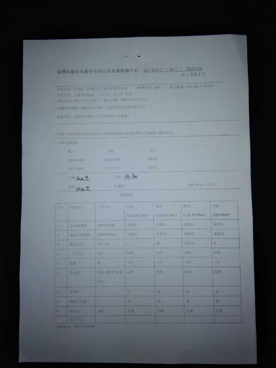 淄博灃泰供水服務有限公司管網水抽檢報告