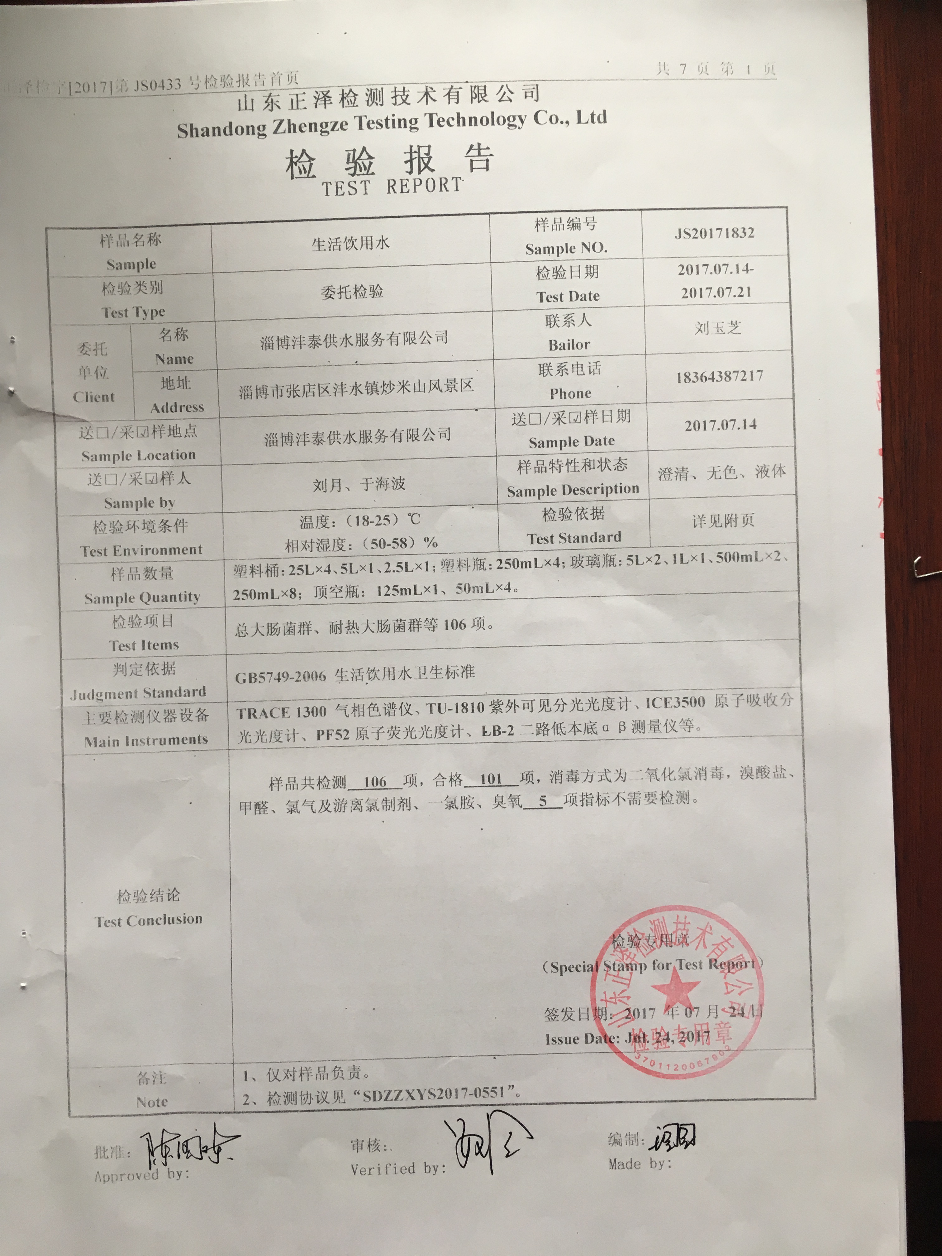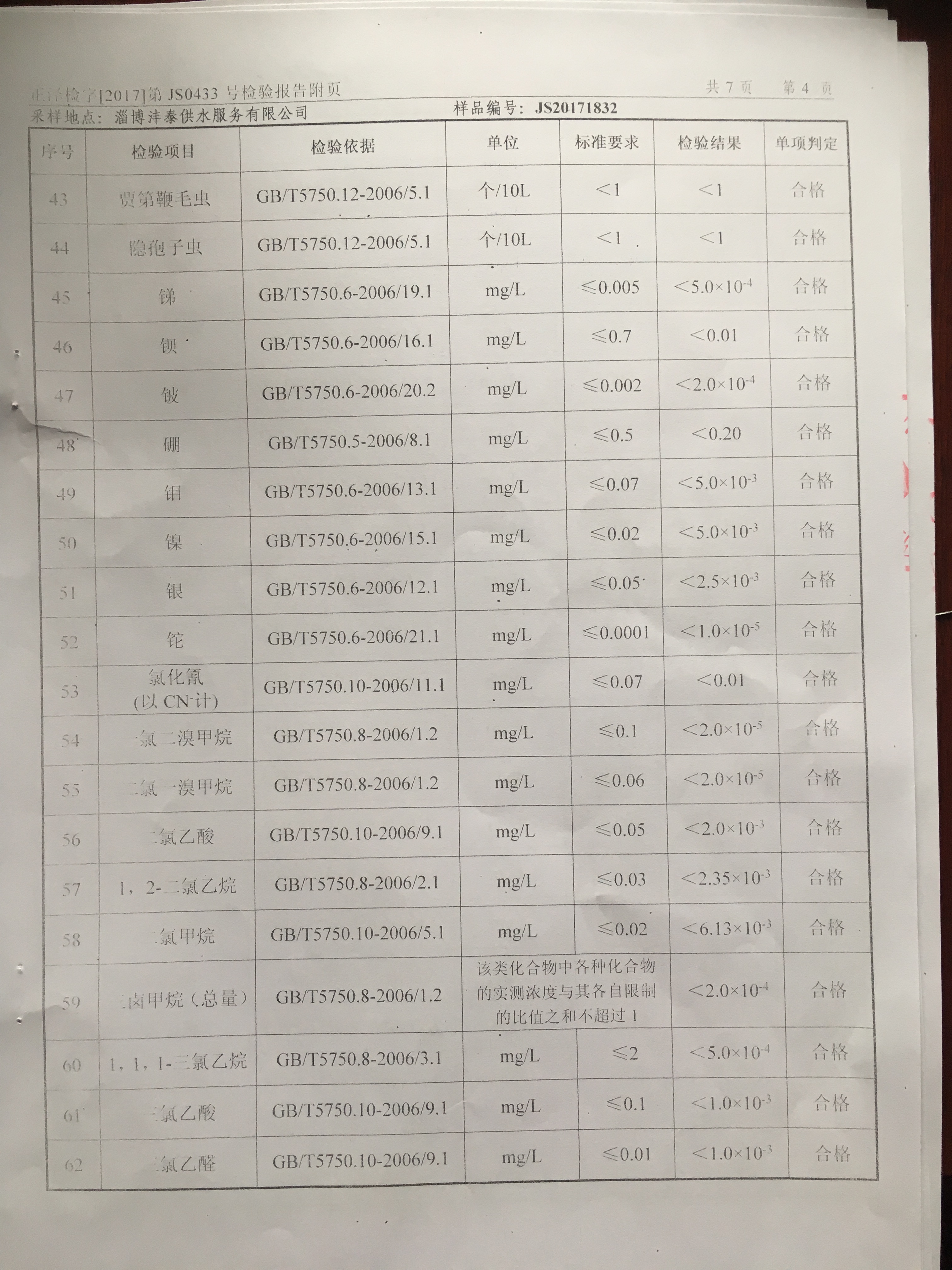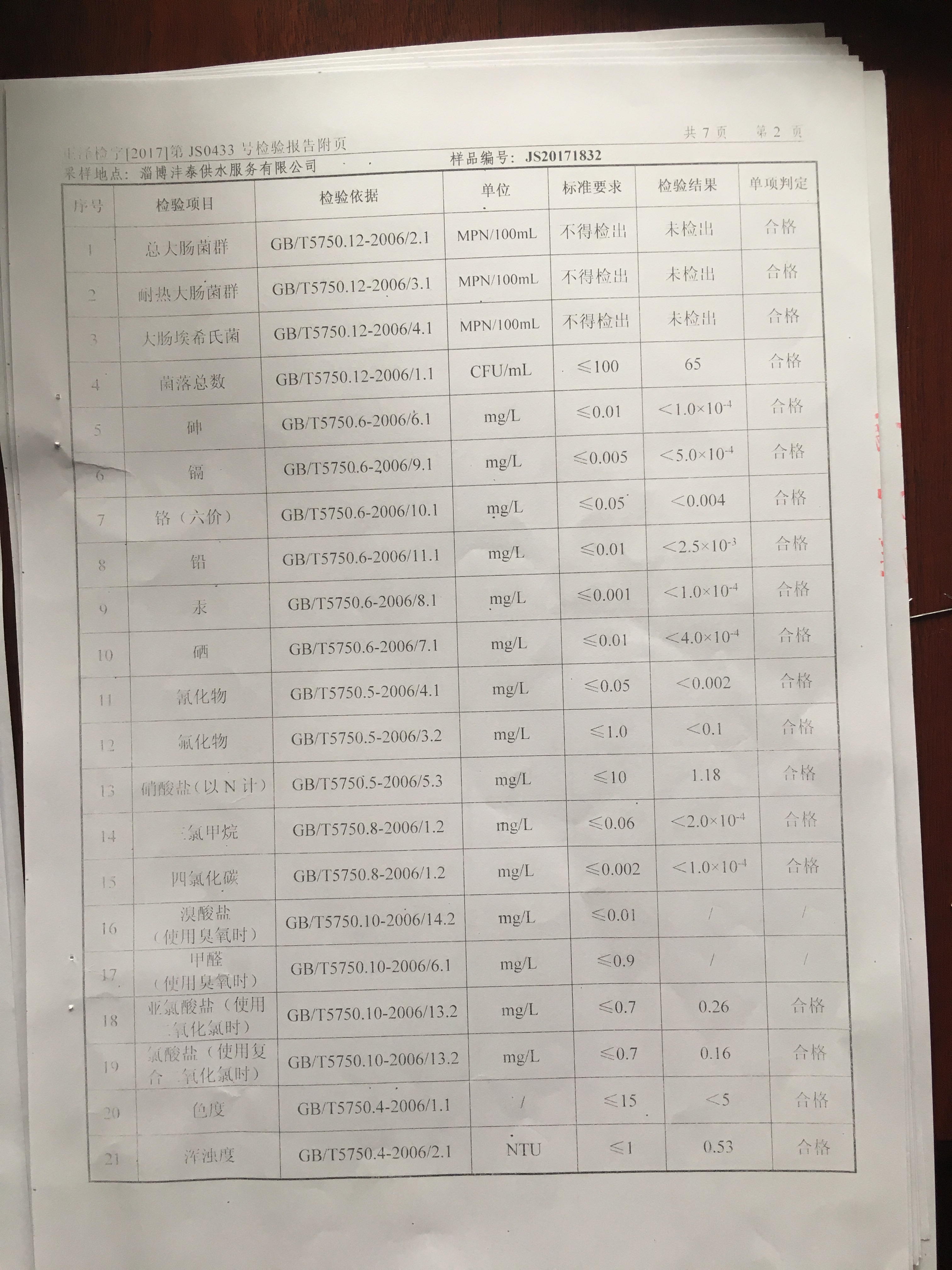 淄博灃泰供水服務有限公司出廠水檢測月報表
