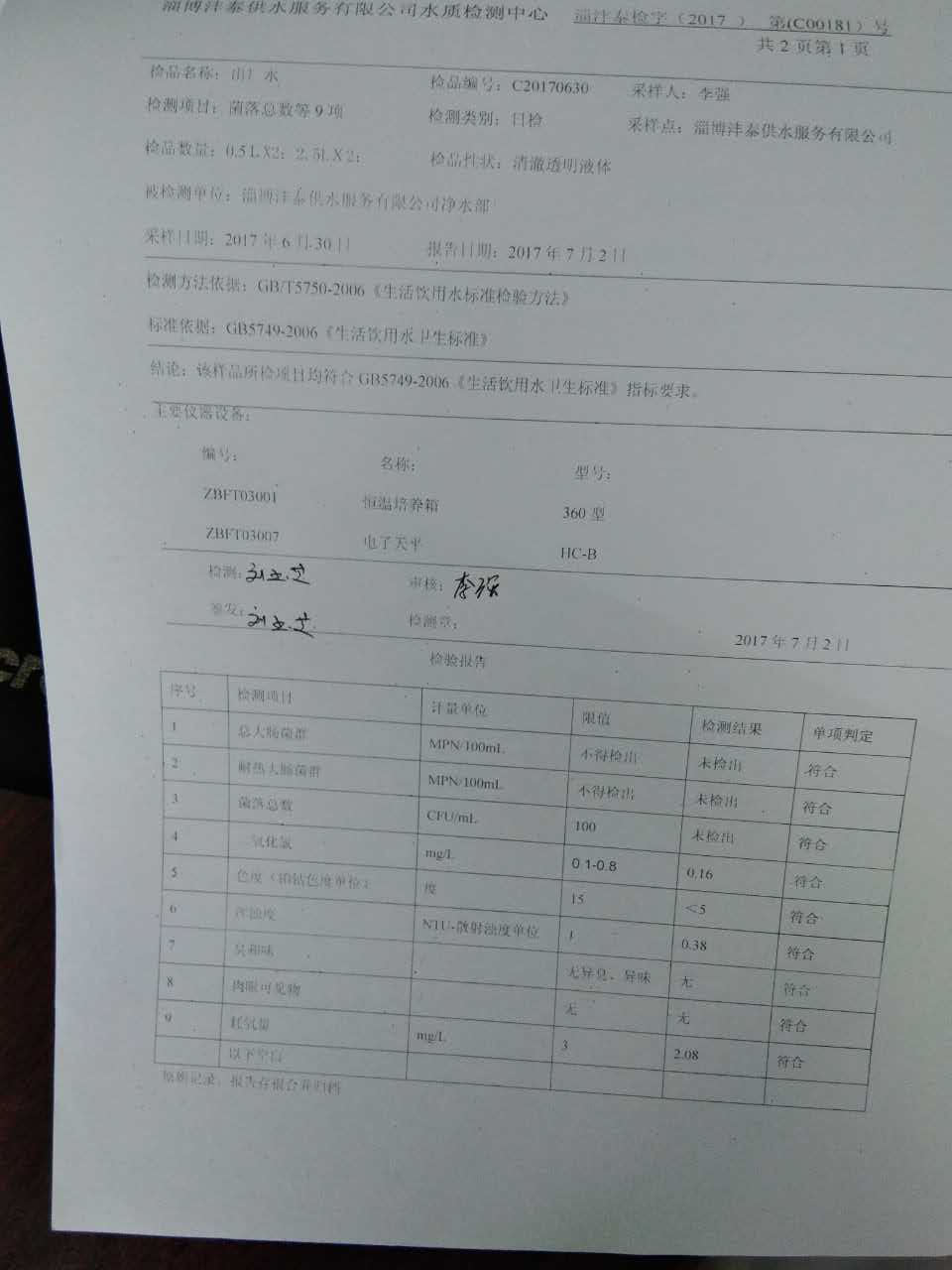 淄博灃泰供水服務有限公司出廠水檢測日報表